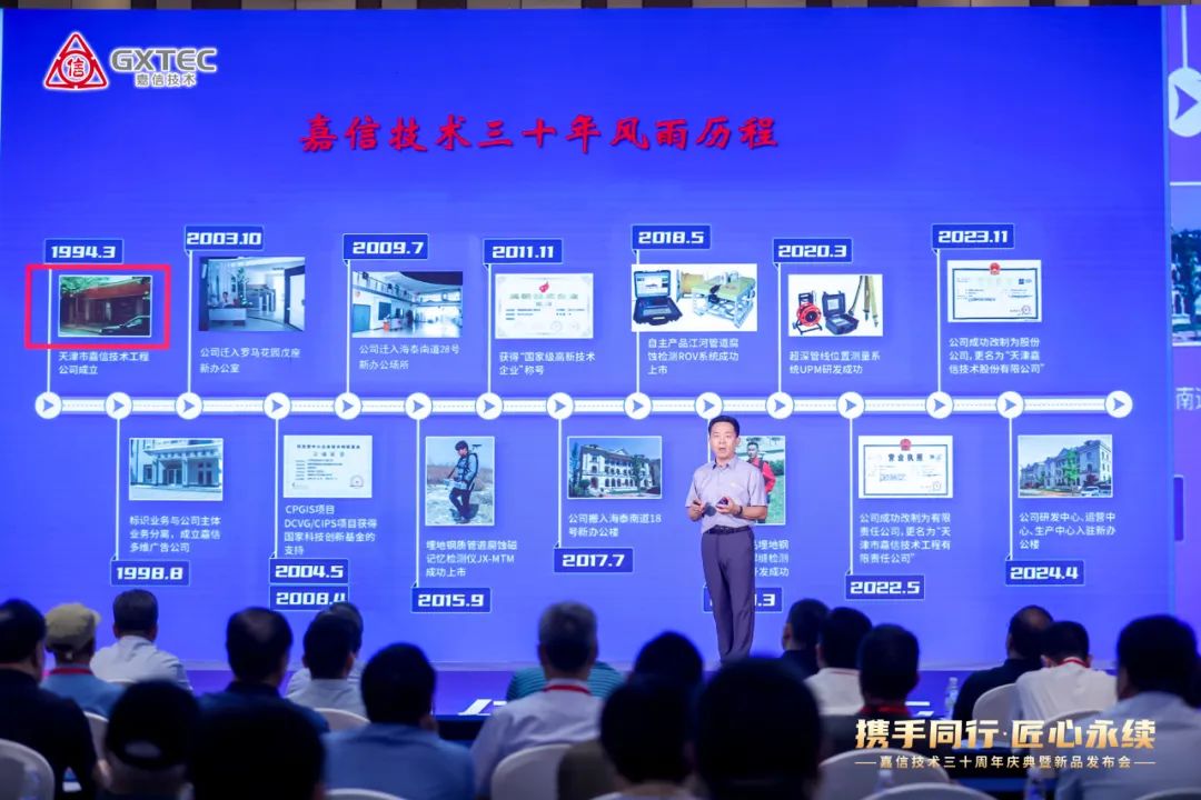 2024年6月26日,嘉信技术三十周年庆典暨新品发布会在天津盛大召开。天津滨海高新技术产业开发区海泰办主任张小平、中国腐蚀与防护学会荣誉理事长陈光章、中国地质学会非开挖专业委员会副主任委员李学军、中国测绘学会地下管线专业委员会常务副秘书长刘会忠、华北地质勘查局519大队队长韩彦伟、四川德源管道科技股份有限公司总经理姜世强、中国石油集团工程材料研究院有限公司特聘专家韩文礼、中石化管道技术服务有限公司总经理王泽浩、北京安科科技集团有限公司高级副总裁易晓明、咸亨国际科技股份有限公司副总裁林化夷、南开大学双创学院张玉利等400余位来自全国各省市级特检院、检验检测机构、技术服务机构、国家管网、中国石油、中国石化、中国海油、中国航油、各省市管网(燃气)集团等单位主管领导和专家以及嘉信技术多年的合作伙伴共赴盛会,共庆嘉信技术成立30周年,一同见证管道防腐层检测仪PDM震撼发布。