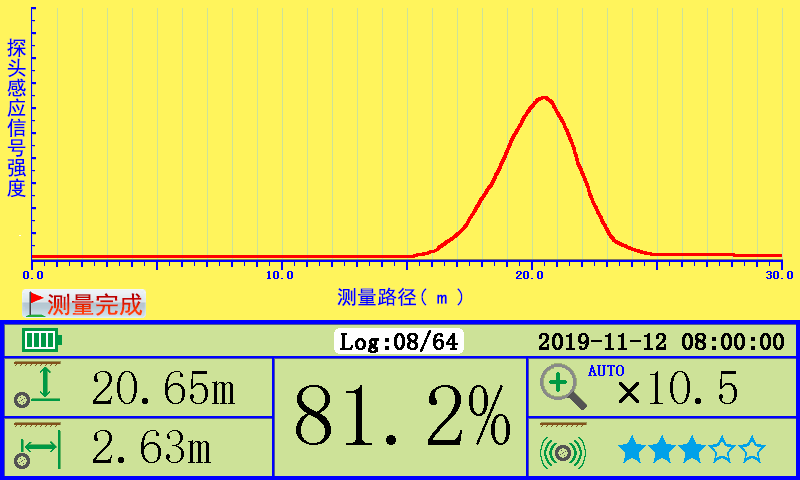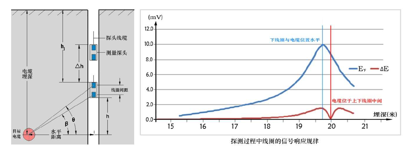 探头内置线圈感应到信号的变化情况实时反应探头与目标管线水平距离,根据测量探头在不同深度测得的感应电动势变化以及探头的下放深度,可计算出管道具体探头的水平距离以及埋深。为精确测得探头下放深度,系统的放线装置特定制高灵敏传感器,精准掌握探头下放深度。系统水平距离测量深度可达5%±0.1m,埋深测量精度可达1%±0.1m。