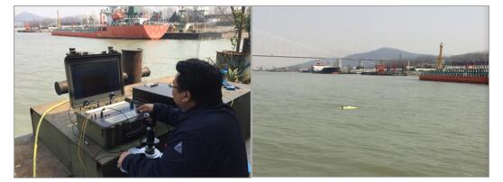将调试良好的ROV下水进行管道定位、测埋深及水深测量;获取、标注GPS坐标;定位过程中记录管道正上方阴保电位及电位梯度,并在近岸水域用有尾线测量标定无尾线测量参数,进入主航道区域采用无尾线方式实施阴保电位及电位梯度检测。